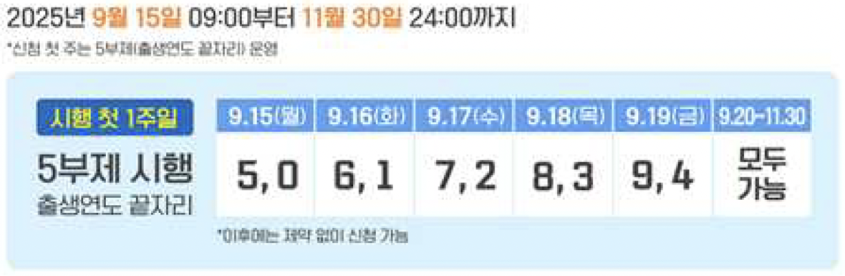 - 5부제 신청제 : 첫 주(9월 15~19일)는 출생년도 끝자리 기준 5부제 방식 적용(이 후 다음주인 9월 20일)부터는 제한없이 신청가능)
