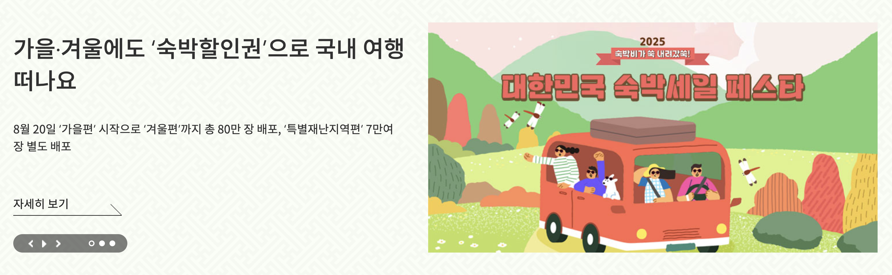 가을·겨울에도 ‘숙박할인권’으로 국내 여행 떠나요 8월 20일 ‘가을편’ 시작으로 ‘겨울편’까지 총 80만 장 배포, ‘특별재난지역편’ 7만여 장 별도 배포